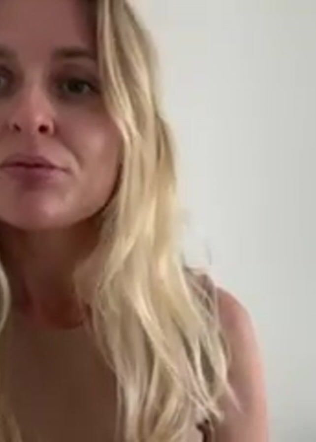 blonde woman putting on lip gloss. She applies the gloss with a wand applicator, then holds the lip gloss tube in her left hand and a small bottle in her right. She speaks to the camera. She is wearing a beige top. The background is a white wall with a door partially visible on the left and an electrical outlet on the right. Music is playing.