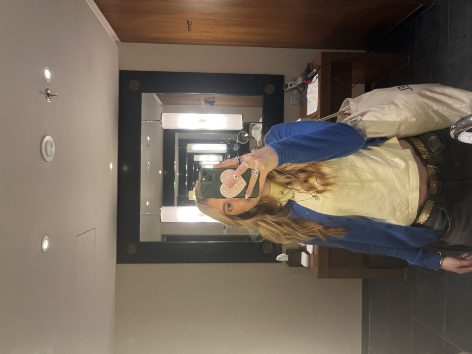 A female individual is depicted in a mirror selfie taken within an interior space, identified as a room in Chengguan District, China. The individual has long, wavy, light brown hair and is dressed in a royal blue button-up cardigan over a pale yellow long-sleeved top, paired with dark-colored trousers and a gold-colored, patterned belt. Multiple rings are visible on the fingers of her right hand, which holds a smartphone featuring a dark green case and a pink heart-shaped, textured pop-socket style grip, obscuring the lower half of her face. A light-colored canvas tote bag is carried over her left shoulder. The reflection reveals a large rectangular mirror with a dark frame and corner embellishments, flanked by two vertical, illuminated light fixtures. Below the mirror is a dark wooden counter, upon which a tissue dispenser and other items are placed on the left, and a hairdryer with small objects are visible on the right. The walls are light beige, the ceiling is white with recessed lighting and a visible access panel, and the floor consists of dark tiles. A dark wooden door is discernible in the background reflection.