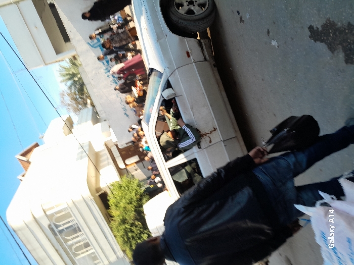 A crowded street scene focuses on a white van packed with people. Many people are near the van on the left of the image. The perspective is from ground level looking up and to the right at an oblique angle. A person wearing a black jacket, jeans, and carrying a black bag, is positioned in the lower right corner of the image. The camera is identified as "Galaxy A14". Buildings and a palm tree are visible in the background.