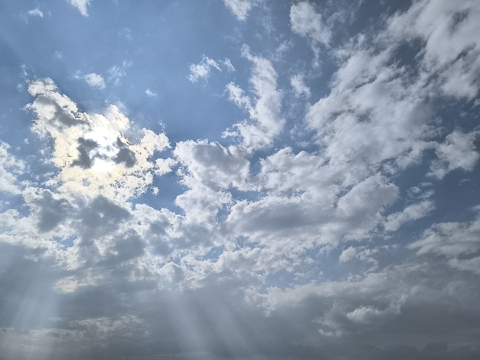 A wide-angle view of the sky above Chamanzar, Uzbekistan, is presented. The scene is dominated by a partially cloudy sky, featuring a mixture of bright white and light to dark grey cumulus and stratocumulus clouds. The sun, partially obscured by clouds in the upper-left quadrant, emits visible crepuscular rays that penetrate through gaps in the lower cloud cover, extending diagonally downwards towards the lower-left and lower-right portions of the frame. Patches of clear blue sky are visible between the cloud formations. No ground features, structures, people, or man-made objects are discernible within the frame.
