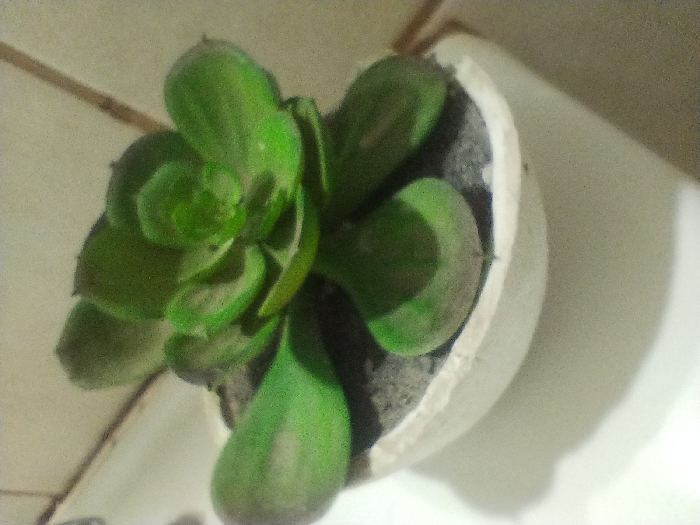 The scene, located in Godoy Cruz, Argentina, depicts a single potted succulent plant. The plant consists of multiple fleshy, medium-green leaves arranged in a rosette pattern. The leaves exhibit a slight surface texture, possibly dust or fine fibers. The plant is contained within an off-white, bowl-shaped pot with a somewhat irregular upper rim. Dark gray, granular material, likely soil, fills the pot around the plant's base. The pot rests on a flat, light-colored surface, casting a soft, diffuse shadow to its left. In the upper-left background, a section of a light-toned tiled wall is visible, marked by a distinct grout line. No people or overt actions are present. The image possesses a discernible grainy quality.