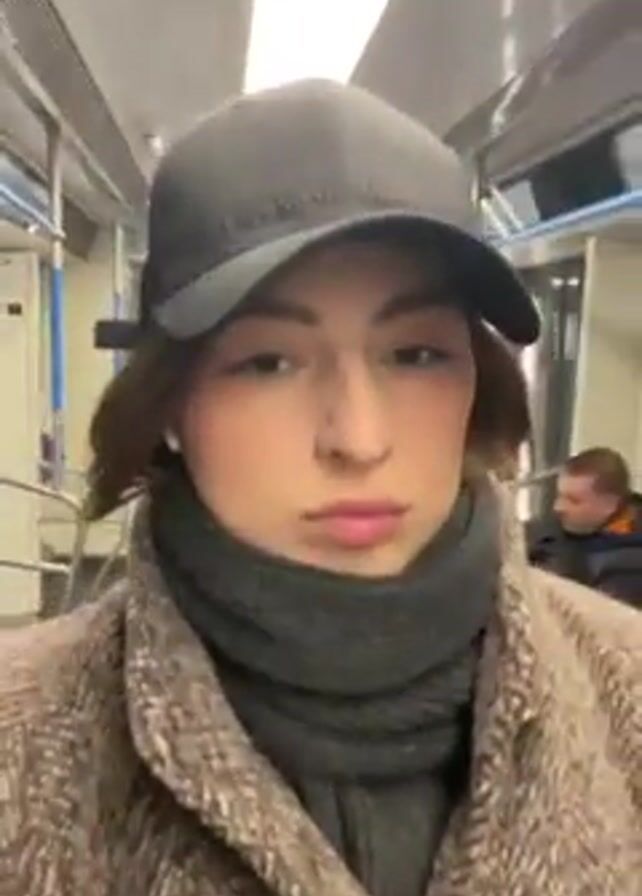 A person stands inside a moving train car, recording themselves. The person wears a brown, textured coat, a dark scarf pulled high around their neck, and a dark baseball cap. The interior of the train car is visible. The camera moves slightly, showing the length of the car and the ceiling with light fixtures. Other passengers are partially visible.