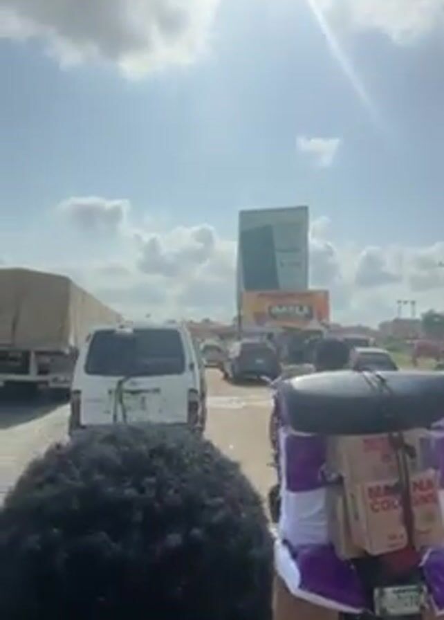 motorcycle heavily loaded with boxes and packages, as viewed from behind another motorcycle. The motorcycle is laden with cardboard boxes labeled "MANNA COLOGNE," and wrapped in purple and white packaging. The scene is a busy road with cars, trucks, and motorcycles navigating traffic. A large billboard advertising "IMOLE" is visible in the background, under a partly cloudy sky with the sun shining brightly. The focus is on the overloaded motorcycle and the challenge of navigating the traffic.