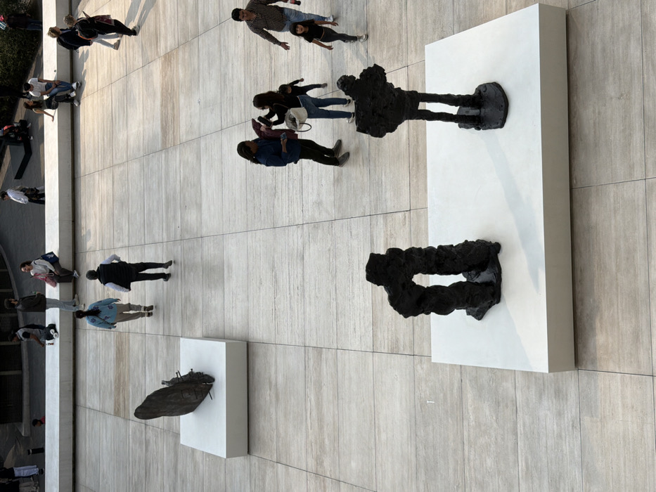 An overhead shot captures a museum courtyard with several abstract sculptures on white plinths. Dark, amorphous shapes contrast against the light stone floor. Groups of people walk through the space, their shadows cast by the bright overhead light. The sculptures vary in form, one resembling a figure and another more like a curved, organic shape.
