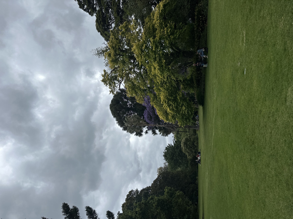 A grassy park features trees, some with yellow leaves and purple flowers, under a cloudy sky. People gather near the trees at the edge of the lawn. The grass occupies a significant portion of the scene. Dark green trees further back contrast with the lighter foliage in the foreground. The sky is overcast.