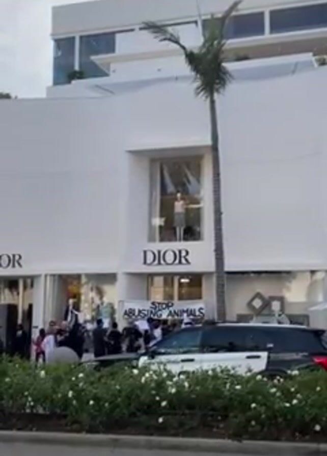 A demonstration is taking place in front of a Dior store. People are gathered behind a banner that reads "Stop Abusing Animals." A police vehicle with flashing lights is positioned near the demonstrators. A tall palm tree stands to the side of the building. The sky is overcast.