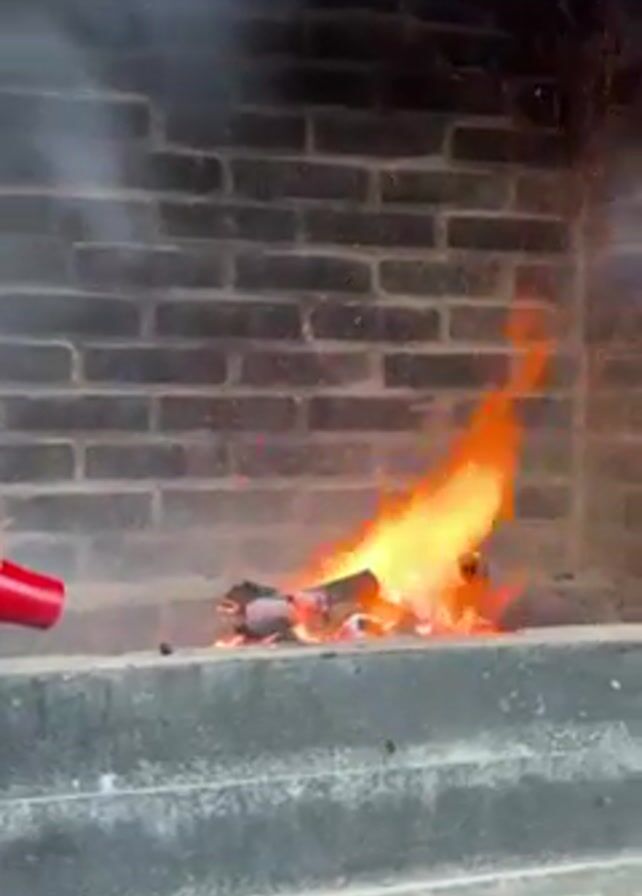 A fire burns in a brick fireplace. Someone is using a red tool to fan the flames, which are orange and yellow. There is smoke and sparks rising from the fire. The fireplace is made of gray bricks and a gray concrete base. The tool has a black cord.