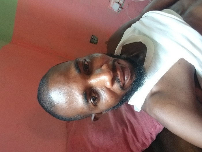 A man with a beard and short hair rests on a red pillow, wearing a white tank top. He faces the camera with a slightly open mouth. The background includes a pink wall and a power outlet. The image has a somewhat tilted perspective, giving a casual and personal feel. The man's skin appears slightly shiny under the lighting.