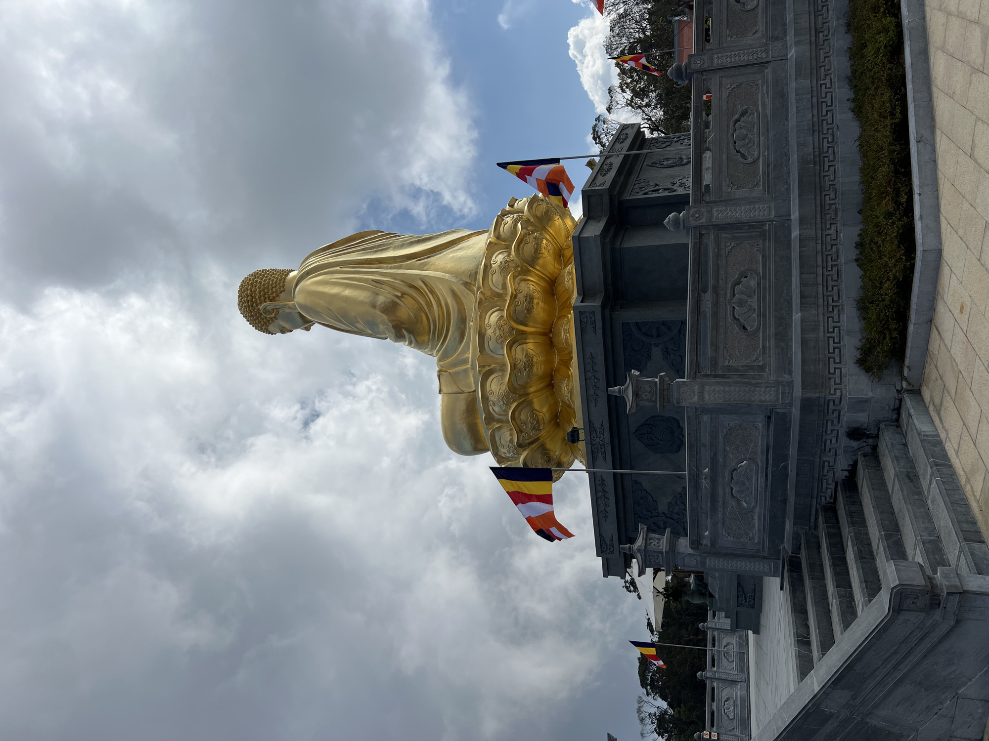 A colossal golden Buddha statue, seated in a meditative lotus posture and facing left, dominates the central frame. The Buddha's head exhibits tight curls, and its body is draped in a smooth, flowing golden robe. It rests upon an ornate golden lotus base, which is set atop a large, multi-tiered dark grey stone pedestal. The pedestal features intricate carvings, including stylized lotus patterns and geometric borders. Dark grey stone balustrades, embellished with small stone lanterns and carved panels, enclose the area immediately surrounding the pedestal. A wide staircase, constructed from matching dark grey stone, ascends towards the monument in the foreground. The ground level comprises light-colored square paving stones, bordered by a strip of low, dark green bushes at the base of the pedestal. Multiple Buddhist flags, characterized by vertical stripes of blue, yellow, red, white, and orange, are positioned on poles around the statue and in the distant background. Mature trees are visible behind the monument, suggesting an elevated or natural environment. The sky is partly cloudy, with visible patches of blue. The scene is located in Unknown, Vietnam.