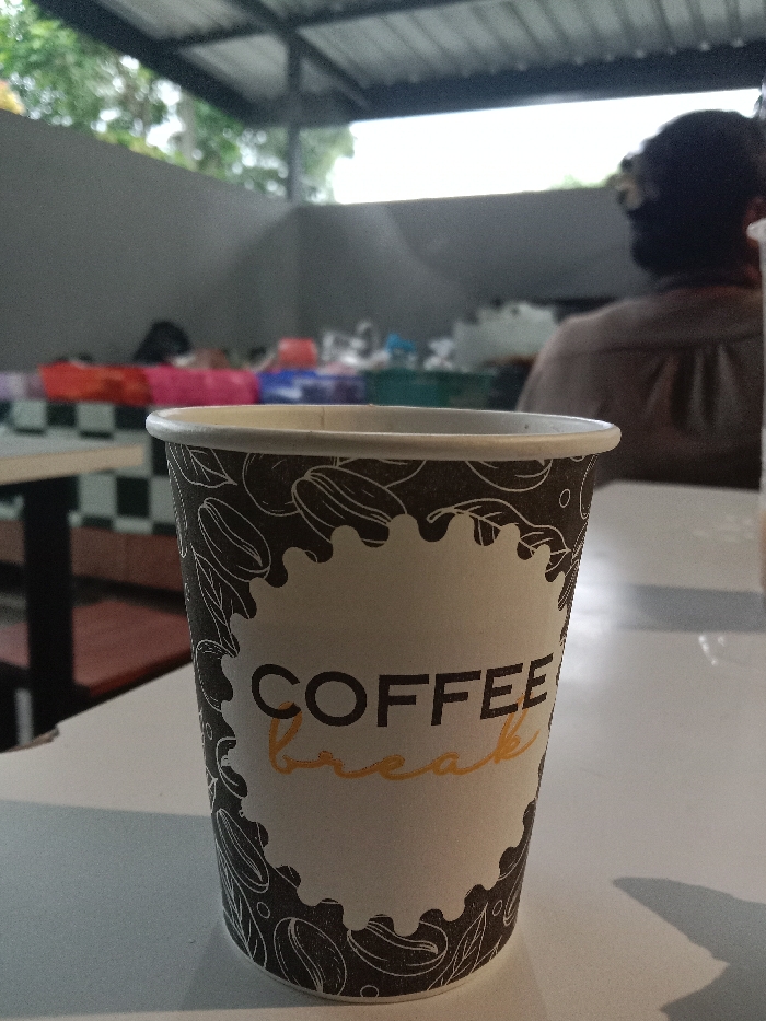 A brown and white paper coffee cup, marked with "COFFEE break" and a coffee bean pattern, stands prominently on a white table surface in the foreground. The cup appears to contain a dark liquid. In the blurred midground to the left, a table with a black and white checkerboard tablecloth is visible, along with a reddish-brown bench. Further back, a collection of out-of-focus colored containers, possibly food items, are arranged. To the right background, an individual with dark hair tied back is seated with their back to the camera, wearing a dark garment. Overhead, a corrugated metal roof is visible, suggesting a semi-outdoor dining or waiting area. Beyond the roof and a gray wall, trees and an overcast sky are discernible. The scene is located in a casual eatery or cafe setting in Semarang, Indonesia.