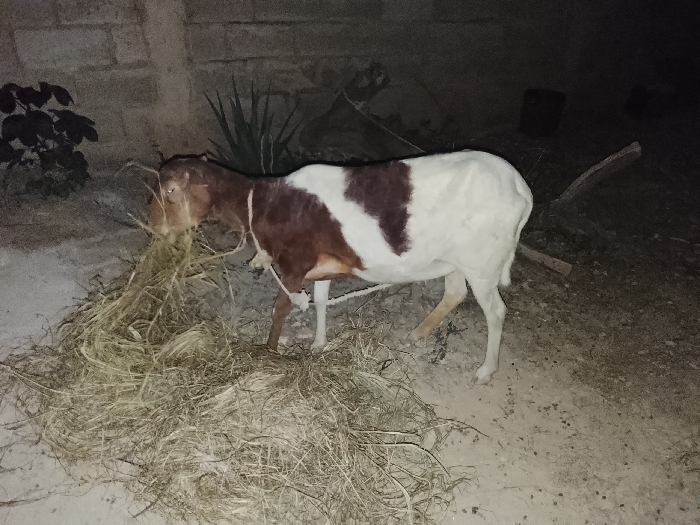 - "A medium-sized goat, predominantly white with irregular brown patches on its head, neck, shoulders, and left flank, is depicted in an outdoor or semi-enclosed area in San Antonio, Venezuela" by FM-FtvzI3, licensed under CC BY 4.0