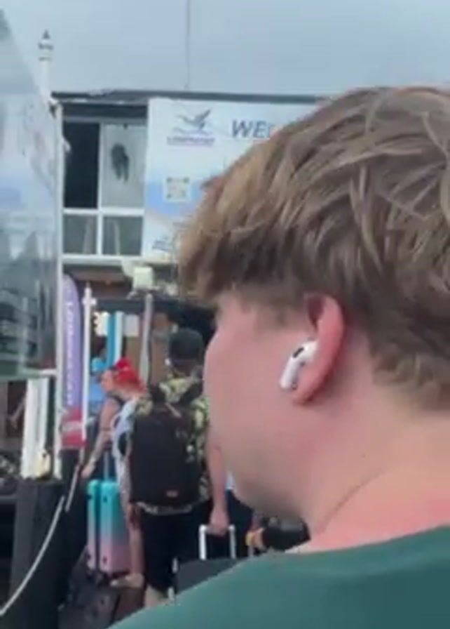 crowd of people exiting a building labeled "Lomprayah Exit". The building has a sign that reads "Welcome to Koh Tao." Most people are pulling luggage and wearing backpacks. The environment appears to be a pier or port. The weather is overcast. One woman in the foreground is holding a phone or microphone and seems to be filming.