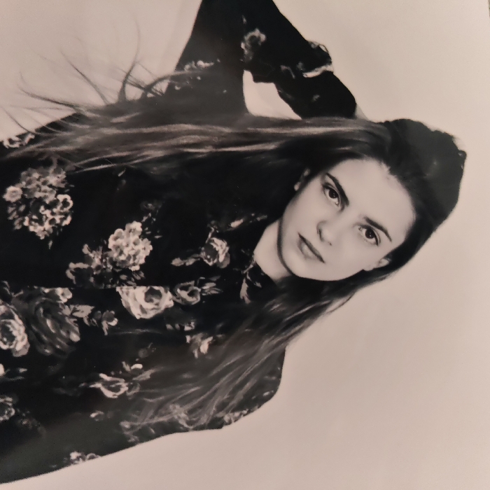 The image is a black and white portrait of a female subject, angled approximately 45 degrees to the lower right. The subject has long, dark hair, styled to appear windswept, cascading over her left shoulder and chest. She is wearing a dark-colored garment with a floral pattern, featuring lighter-toned flowers. Her left arm is raised, with her hand positioned near the top of her head, partially obscured by her hair. Her face is turned towards the camera, with a direct gaze. Her mouth is closed, and her expression is neutral. The background is a plain, light-colored surface, suggesting a studio or controlled environment. There are no other discernible objects or subjects in the frame. The visual evidence presented does not provide information to determine a specific location within the city of Dubovka, Kazakhstan, or any other geographic location.