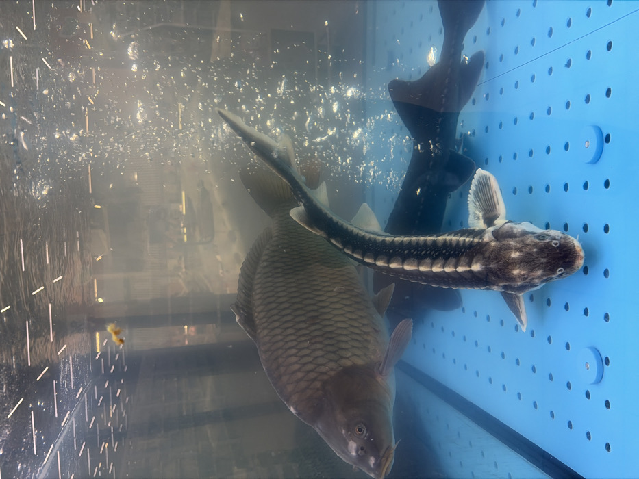 The image displays a clear glass tank containing live fish. A large Common Carp, characterized by dark scales and barbels, swims horizontally on the left side of the tank. In the foreground, a smaller Sturgeon, exhibiting dark and light mottled patterns and a pointed snout, faces directly towards the viewer. A second, darker-bodied sturgeon is partially visible in the background, to the right of the foreground sturgeon and beneath the carp. The tank's floor is a bright blue, perforated surface. Clear water fills the tank, with a visible stream of aeration bubbles rising on the right side. Reflections of overhead linear lighting fixtures are present on the water's surface and the tank's glass. The scene is consistent with a commercial establishment selling live fish, such as a supermarket or seafood market, in Saint Petersburg, Russia, although the precise location within the city cannot be determined from the visual evidence.