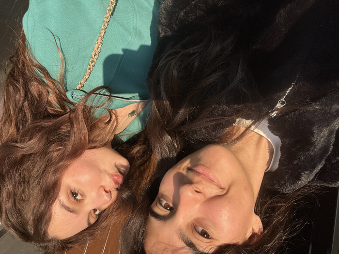 Two young women lie side-by-side, heads touching, facing the camera. One wears a teal jacket with a gold chain strap, her reddish-brown hair cascading around her face. She has her lips slightly pursed. The other wears a black faux fur jacket over a white shirt. Her dark hair also surrounds her face. They are lying on a surface of what appears to be wood or metal, under bright sunlight.