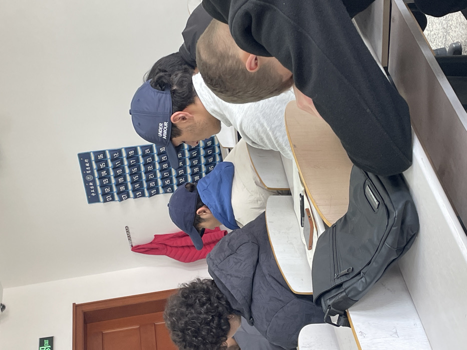 The scene depicts a classroom or lecture hall environment in Daxing District, China, indicated by the Chinese text on the wall organizer and exit sign