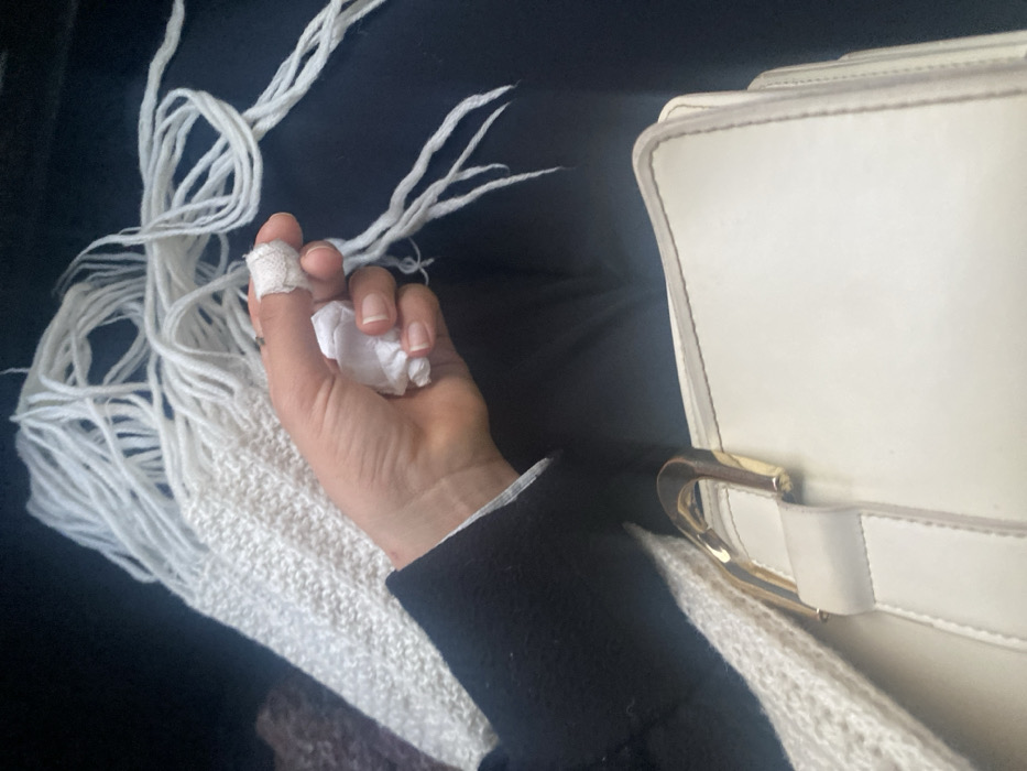 The image captures a close-up, downward perspective of a person's upper legs, lap, and right hand within an interior setting in the city of Bembla, Tunisia. The visible right hand has its thumb wrapped in white bandage material and is holding crumpled white tissue paper. The person wears a dark-colored long sleeve, with a white cuff partially visible, and dark trousers or a skirt. A white, coarsely knitted or woven textile with long fringes, possibly a scarf or blanket, is draped across the lap, primarily on the left. To the right, a light-colored (off-white or cream) structured handbag with a prominent gold-toned metal clasp or buckle rests on the lap. The background is dark and out of focus.