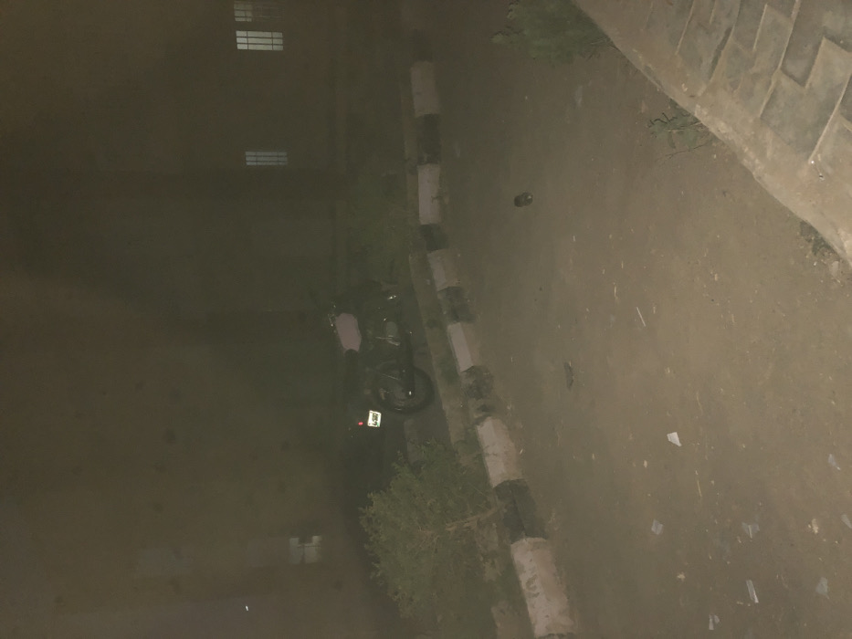 An aerial view shows a dimly lit street at night. A motorcycle is parked on the left side near a curb marked with alternating black and white blocks. Trash and debris litter the street surface. A building with visible windows stands on the left, while a wall made of stone is on the right. The overall scene appears hazy and muted in color.