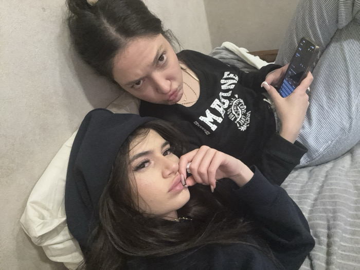 Two young women pose indoors. One is lying down with a hood over her head, and she rests against a white pillow. The other is sitting up, holding a phone with the screen visible, and looking directly at the camera with pursed lips. Both are wearing dark clothing, and the background includes a bed with striped pillows and a plain wall.
