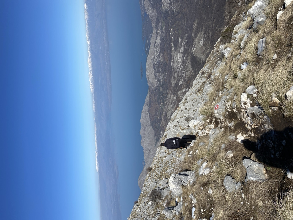 This image presents a panoramic view of a mountainous landscape in Mali Mikulići, Montenegro. A lone individual is depicted from behind, descending a rocky, arid hiking trail. The person wears a dark long-sleeved top with a white "Puma" logo visible on the left shoulder and dark lower garments. A dark-colored animal, consistent with a dog, walks on the path slightly ahead of the person. The foreground and mid-ground consist of steep, rugged terrain characterized by light grey rocks and sparse clumps of dry, yellowish-brown grass. A red circular trail marker with a white horizontal stripe is painted on a rock in the lower center. The shadow of the photographer and camera is cast onto the trail in the lower-left quadrant. In the middle distance, a large body of deep blue water, likely a lake or bay, stretches under a clear, cloudless blue sky. Beyond the water, a range of distant mountains with visible snow-capped peaks defines the horizon. The scene is illuminated by bright daylight.