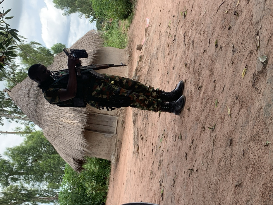An individual in military-style camouflage fatigues, a dark tactical vest, and black combat boots stands on reddish-brown dirt ground in Sankara, Nigeria