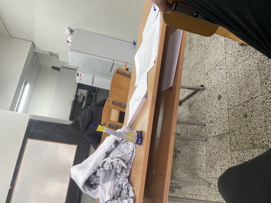 The scene depicts an indoor institutional room, likely a classroom or study area, integrated with a kitchenette, located in Unknown, Unknown. The room features light-colored walls and a speckled light grey terrazzo floor, illuminated by overhead fluorescent lights. In the immediate foreground, the perspective originates from a seated individual, evidenced by legs clad in dark pants and a hand gripping the wooden back of a light-colored chair. A light wooden desk is positioned directly in front of this viewpoint. On the left side of this desk, a white hooded sweatshirt with black and grey speckled patterns is draped. A partially collapsed yellow and blue flexible pouch stands upright on the central part of the desk. To the right, multiple white papers, some bearing visible text, are spread across the desk surface, accompanied by a white pen and a blue pen. Further into the room, a second individual with dark hair is seated at a similar light wooden desk, facing away from the camera. This person is wearing a dark, hooded jacket. Behind this individual and to the left, a large rectangular whiteboard with a dark frame is mounted on the wall. To the right of the seated individual, a kitchenette area is visible. This area includes white upper cabinets, a countertop holding a microwave oven and a smaller silver appliance, and two tall white stand-alone refrigerators. A white dome security camera is affixed to the ceiling directly above the kitchenette. Dark cables or conduits run along the upper section of the right wall. Additional empty light wooden desks and chairs are arranged throughout the background.