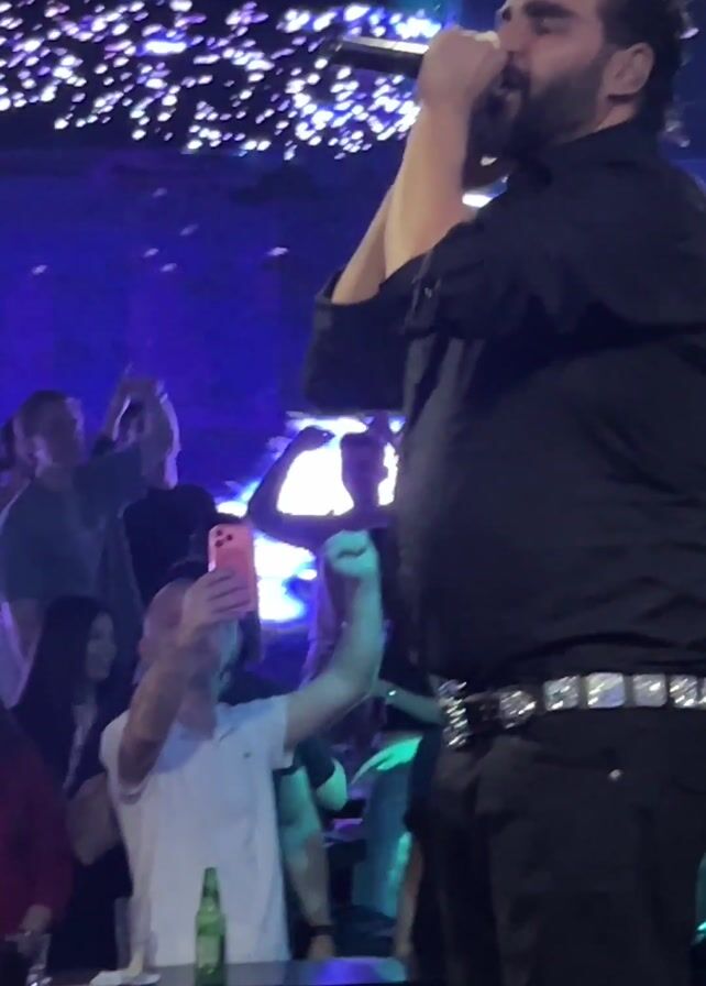 A man in a black shirt and black pants sings into a microphone while standing on a stage. The stage is lit with blue and purple lights, and there is a crowd of people behind the bar in front of the stage. Some people are taking photos with their phones, and some are dancing. The man is wearing a belt with large, square buckles. A chandelier hangs from the ceiling.