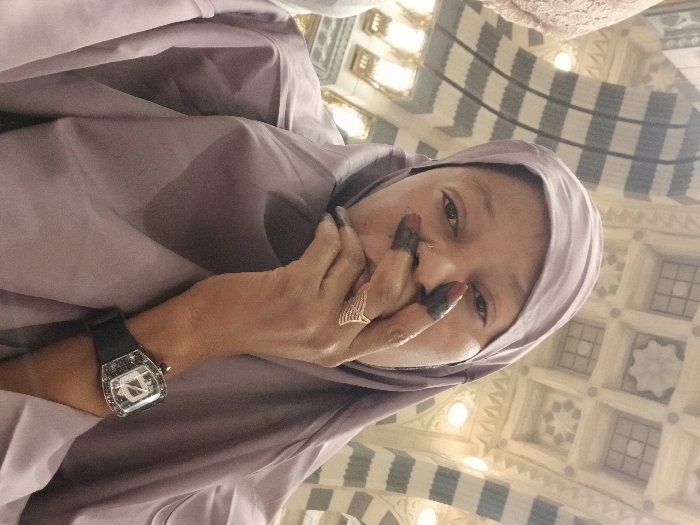 A close-up, low-angle selfie depicts an individual, likely female, with dark skin, wearing a light purple hijab that covers the head and drapes over the shoulders