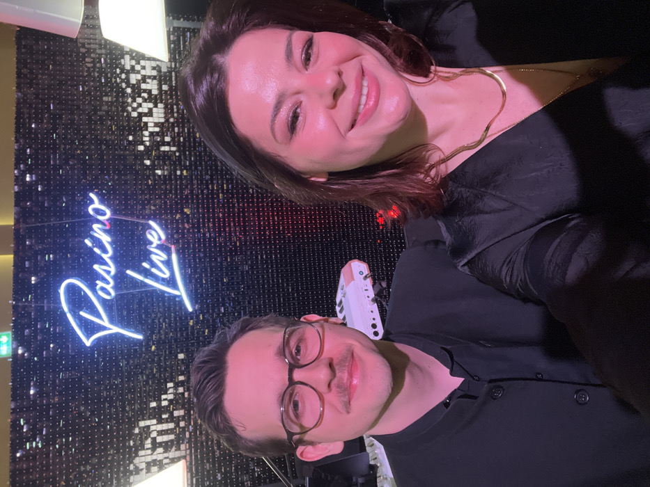 A man and woman smile at the camera against a shimmering wall with the words "Casino Live" in neon lights. The man wears glasses and a black button-down shirt. The woman, slightly above, wears a dark top and a gold necklace. A white instrument rests beside the man. The lighting casts a pinkish hue over the scene.