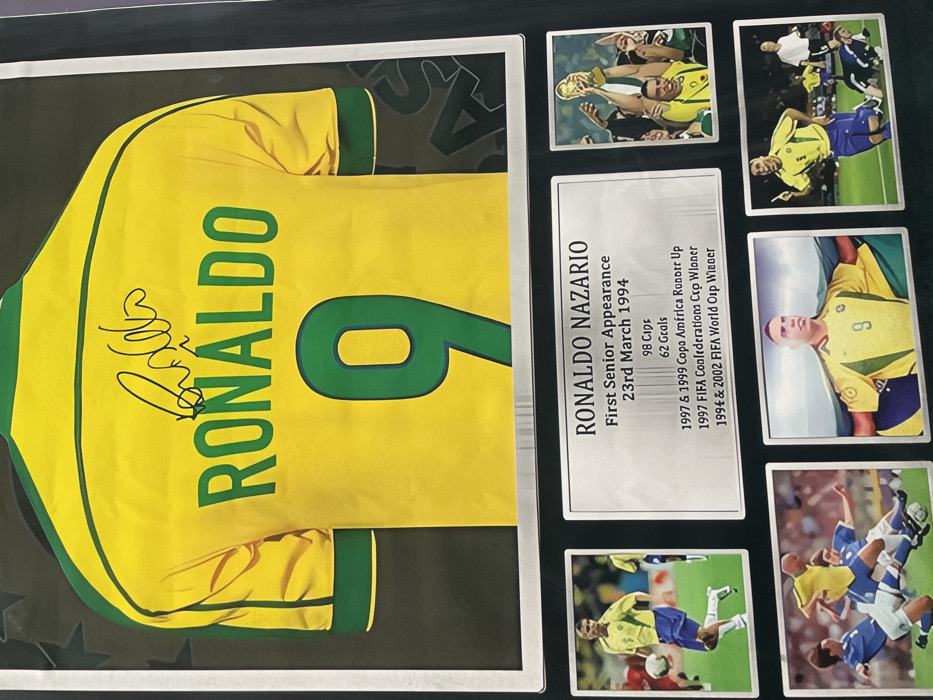The image displays a framed sports memorabilia collection. Central to the display is the back of a yellow and green soccer jersey, prominently featuring "RONALDO" in green block letters and the number "9" directly below it. An autograph, appearing to be "Ronaldo," is handwritten in black above the name. The jersey is set against a dark background, possibly fabric. Below the jersey, a silver-colored plaque details "RONALDO NAZARIO" with career statistics including "First Senior Appearance 23rd March 1994," "98 Caps," "62 Goals," "1997 & 1999 Copa América Runner Up," "1997 FIFA Confederations Cup Winner," and "1994 & 2002 FIFA World Cup Winner." Surrounding the plaque and below the jersey are five smaller framed photographs. These photographs depict Ronaldo Nazario in various action shots and celebratory moments as a soccer player, including: dribbling a ball on a field in a yellow and blue uniform; celebrating with the FIFA World Cup trophy alongside other individuals; engaging in a game against opponents; posing in a yellow and green jersey with arms outstretched; and celebrating a goal on a field, pointing. The entire collection is enclosed within a dark frame, indicative of an indoor setting. The precise location within Blagoevgrad, Bulgaria, is not discernible from the visual information provided.