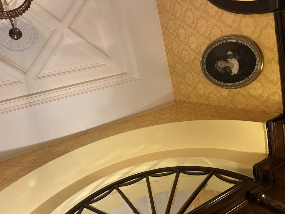 The image displays an upward-angled view of a richly decorated historical interior, identified as a space within the Kurhaus Wiesbaden in Wiesbaden, Germany. The right wall is covered in a gold-colored wallpaper patterned with a light-toned, repeating damask motif. Centered on this wall, an oval-framed portrait depicts a fair-skinned individual, likely female, with light hair, wearing dark clothing accented by a white collar. The portrait's frame is ornate and metallic. The white ceiling features intricate plasterwork, including a pattern of recessed panels forming a cross or X-shape, and a central circular medallion. A bronze-toned, ornate ceiling-mounted light fixture with a glass shade is partially visible in the upper right quadrant. To the left, a large, rounded archway or window frame constructed of dark, polished wood (likely mahogany or stained oak) extends into the frame. The interior curve of this arch is painted a light yellow-cream color, reflecting light. Below the wallpaper, a dark wooden dado rail or wainscoting corresponds with the archway's timber. The scene is illuminated by ambient light, with reflections visible on the glass panes within the archway structure.