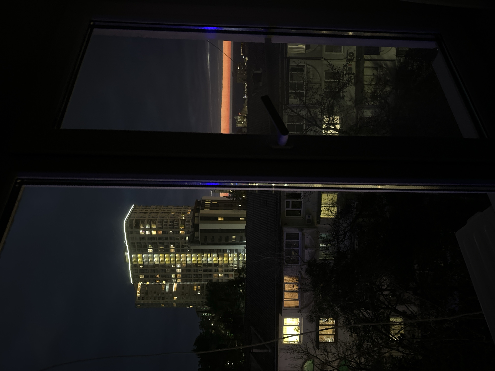 The image displays a nighttime urban landscape viewed through a dark-framed window, split vertically by a central mullion