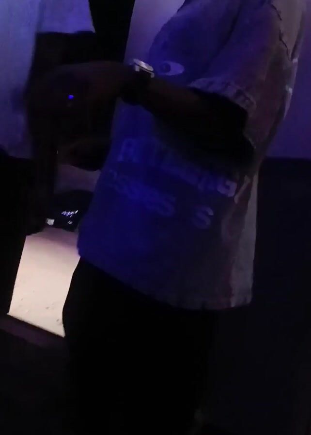 A person wearing a light-colored button-down shirt with the text "Buttlessin" on it and a baseball cap stands indoors, moving their hands slightly. Another person in a light blue t-shirt walks behind them. The scene is dimly lit, with a patterned wall to the left and a white wall to the right. There appears to be music playing in the background.