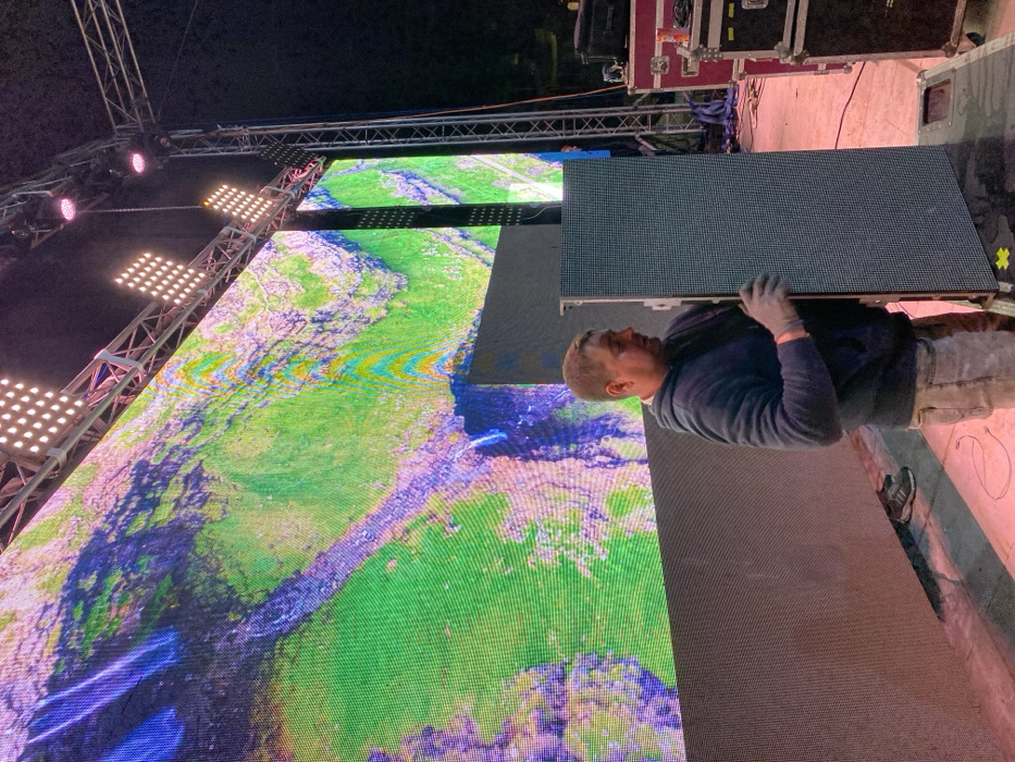 A man wearing a long-sleeved shirt, gloves, and work pants carries a black LED screen panel. He is working on a large outdoor LED display showing a green and purple aerial landscape. Metal scaffolding with lights is visible above the display. The area appears to be an event setup, with equipment cases in the background. Wires are present on the ground nearby.