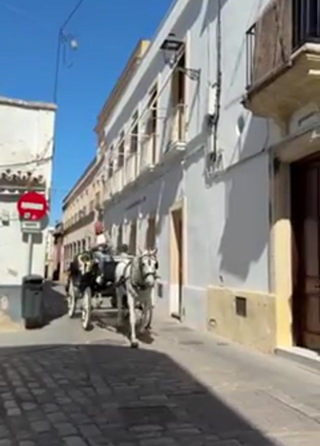 A man drives a horse-drawn carriage down a narrow, cobblestone street lined with white buildings in sunny weather. The horse is white and wears blinders. The man driving the carriage is wearing a long-sleeved white shirt. A “Do Not Enter” sign is visible on the left side of the street. The buildings have traditional architectural details like balconies and window awnings.