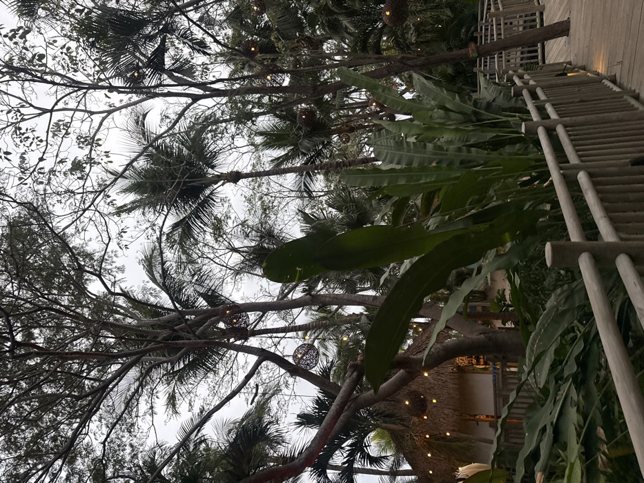 A tranquil outdoor scene with a wooden boardwalk and railing partially visible. Lush green tropical plants and palm trees dominate the composition. The sky above is overcast, casting a soft light. Decorative hanging spheres, possibly lanterns, are suspended from the branches of trees. The overall atmosphere evokes a sense of relaxation and escape within a tropical setting.