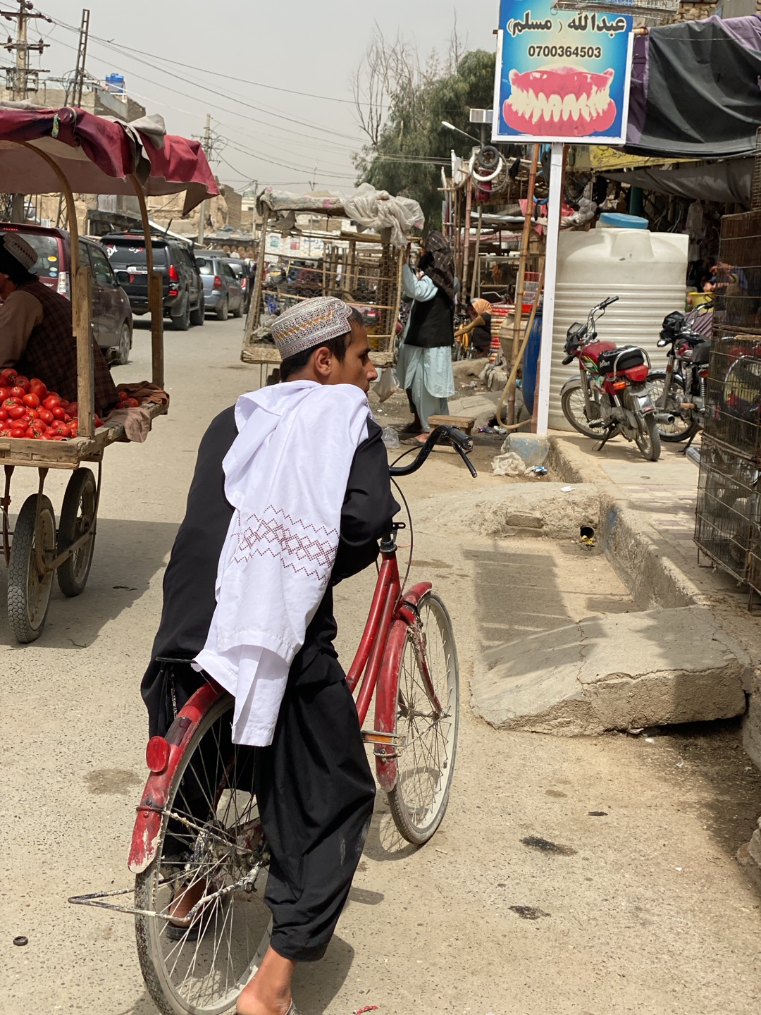 This image depicts a bustling street scene in a commercial district of Kandahar, Afghanistan. In the immediate foreground, a young male, wearing black traditional clothing and a white embroidered skullcap, sits on a red, seemingly aged bicycle, looking to his right. A white garment with red geometric embroidery is draped over his left shoulder and the bicycle's frame. His right foot, bare and clad in a sandal, is visible near the pedal. To the left of the central figure, part of a wooden pushcart with a red canopy is visible, heavily loaded with red tomatoes. Another individual, partially obscured, sits behind this cart. Further down the dusty, unpaved street, a line of cars is visible, indicating traffic. On the right side of the frame, a blue and white sign is affixed to a white pole. The sign displays "عبدالله (مسلم)" (Abdullah (Muslim)) and a phone number (0700364503), prominently featuring a large graphic of a set of pink-gummed white dentures. Behind the sign, a white plastic water storage tank is visible, alongside two parked red motorcycles. Stacks of metal cages, likely for birds or small animals, are positioned to the far right. A man dressed in light blue clothing and a dark vest stands near a stall further down the street, while another person is seated on the ground. The ground is a mix of uneven concrete and dirt, with scattered debris. The background reveals more buildings, stalls, and power lines against a hazy, light sky, with sparse trees visible on the right.