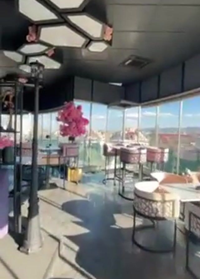 slow pan around a high-end restaurant with a modern, luxurious interior. The space features a black ceiling adorned with illuminated, hexagonal panels decorated with pink floral accents. The room is filled with round tables surrounded by plush seating. Large, floor-to-ceiling windows offer a panoramic view of the city outside. The color scheme emphasizes pink and gray tones. The floor is glossy and reflective. The video captures the overall atmosphere of the restaurant, showcasing its design and view.