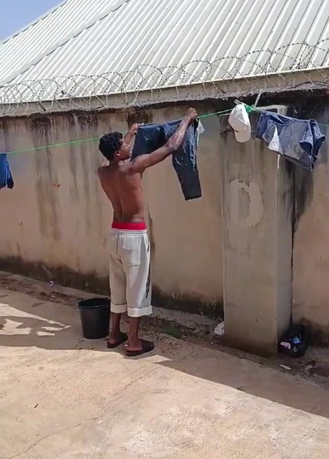 shirtless man hanging clothes on a clothesline in an outdoor space. The man is wearing light-colored shorts with a red band at the top and black sandals. He is hanging a pair of dark pants on the line. There are other items of clothing already hanging on the line, including a white cap, a pair of blue denim shorts, and a red shirt. A black bucket is on the ground near the man. A concrete wall topped with barbed wire serves as a backdrop. The weather is sunny and the ground is concrete.