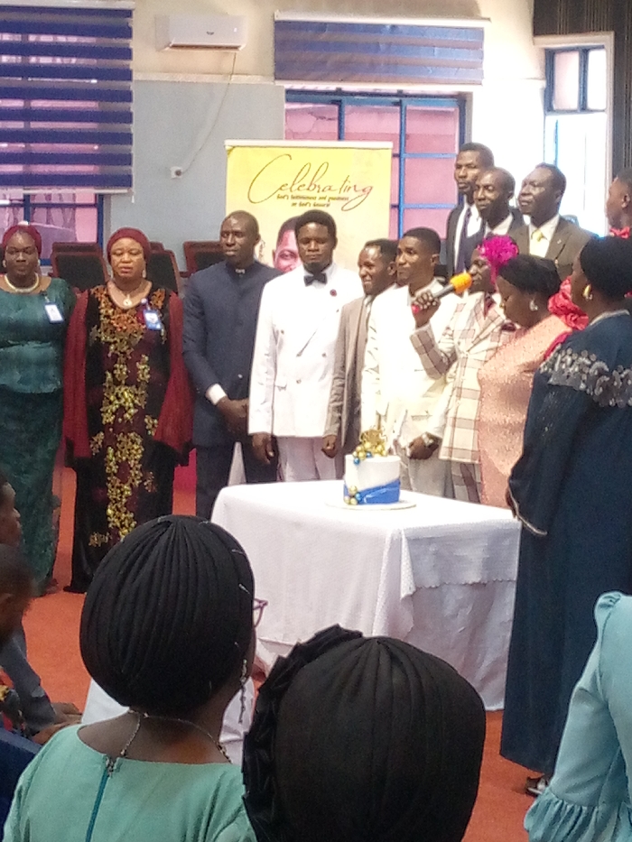 An indoor celebratory event is depicted in the city of Television, Nigeria. In the foreground, two individuals are partially visible from behind; one on the left wears a teal garment and a dark head covering, while the other on the right also wears a dark head covering. In the mid-ground, a white-covered rectangular table displays a two-tiered cake. The cake is predominantly white, featuring a diagonal blue band, gold spherical decorations, and a gold "10" topper. Behind the table, a group of approximately fifteen adults stands in multiple rows. The front row, from left to right, includes a woman in a green traditional dress and red head tie with a blue ID badge; a woman in a dark red floral traditional dress and red head tie with a blue ID badge; a man in a dark blue native attire; a man in a white double-breasted suit with a black bow tie; a man in a light brown suit; a man in a white suit holding a yellow-tipped microphone to his mouth, speaking; a woman in a bright pink head covering and a checkered garment; a woman in a light peach top; and a woman in a dark blue traditional dress with patterned sleeves. Additional men in suits are visible in rows behind the front group. To the left of the group, a yellow banner on an easel displays the word "Celebrating" in cursive script, followed by smaller text "God's faithfulness and goodness," and a partial image of a man's face. The floor is covered with a red carpet. The background features light-colored walls, horizontal blue window blinds on the left, an air conditioning unit mounted high on the wall, and blue-framed windows on the right. The room is brightly illuminated.