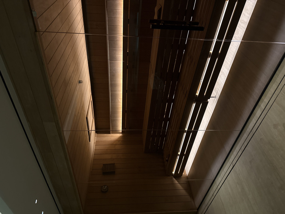 A low-angle shot showcases an architectural interior. Wood-paneled walls enclose a space featuring a suspended slatted structure with illuminated gaps. A dark bar-like fixture intersects the slats. Bare horizontal wires stretch across the composition. One wall has a window and details, including a clock and vent. Light and shadow create patterns on the wood surfaces.