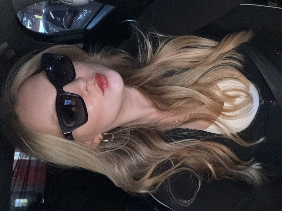A female subject with long, wavy blonde hair is depicted seated inside a vehicle in Hod HaSharon, Israel. She wears large, dark, rectangular sunglasses and gold hoop earrings. Her lips are puckered and coated with a red or pink gloss. A thin gold chain necklace is visible around her neck. She is dressed in a black zippered outer garment over a light-colored inner top. A seatbelt is present across the lower right side of the frame. The background visible through the vehicle's window is blurred, showing indistinct forms consistent with other vehicles or urban infrastructure.