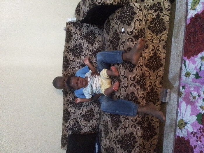 The scene, located indoors in Rimi, Nigeria, depicts two individuals positioned on a patterned sofa against a plain, light-colored wall