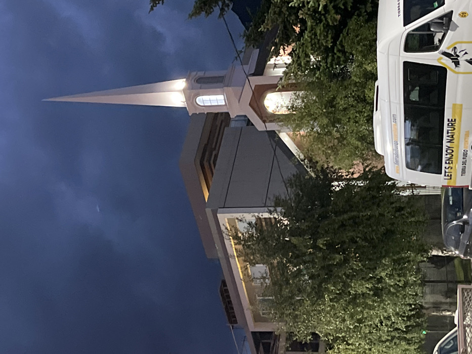 A building with a prominent, sharply pointed tower is viewed against a twilight sky. The tower is illuminated, accentuating its lines. Trees partially obscure the view, with a white van labeled "LET'S ENJOY NATURE" visible on the right side of the image. The building's modern architecture contrasts with the classic steeple design. The light conditions suggest either dawn or dusk.