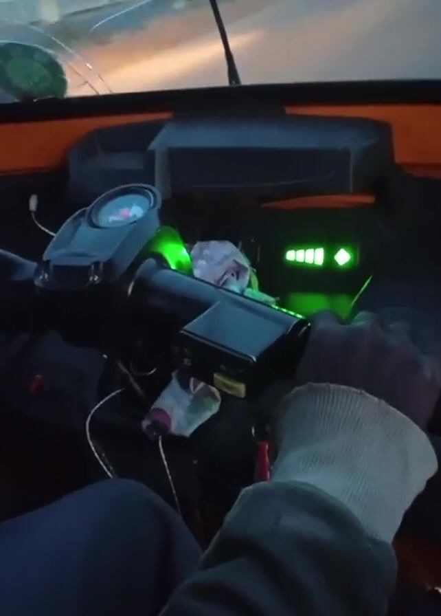 The video is taken from the driver's perspective inside a three-wheeled vehicle, possibly a tuk-tuk, moving down a road in what appears to be a residential or commercial area. The interior of the vehicle is orange and black, with a simple dashboard featuring a speedometer, green lights, and various wires. The driver's gloved hands are visible on the handlebars. Outside the vehicle, other cars and buildings are visible, suggesting an urban or suburban setting. The video appears to be taken during dusk or early evening, as the light is dim but streetlights are not yet fully illuminated.