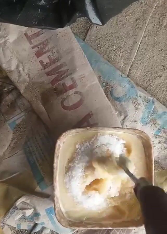 A hand wearing a glove stirs a mixture in a square, speckled brown bowl. The mixture appears to consist of a yellowish, lumpy substance, combined with a sprinkling of white powder. The bowl sits on a surface covered with dust and cement bags, one of which is labeled "CEMENT" in large, red letters. A black plastic bag is partially visible in the upper left corner of the frame.