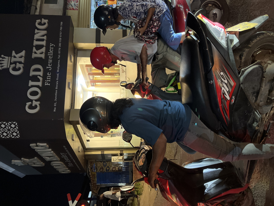 This nighttime image depicts a street scene at No. 01, Junction Borala Road, Weligama, Sri Lanka, identifiable by the prominent "GK GOLD KING Fine Jewellery" signboard. Three individuals are positioned on two parked or stationary scooters. The person on the left is seated on a red and black Honda Dio scooter, wearing a dark grey helmet, a dark blue short-sleeved shirt, and light-colored pants. To their right, two individuals occupy a red scooter; the driver wears a red helmet, a light-colored collared shirt, and light brown trousers, while the passenger behind them wears a black helmet, a patterned shirt, and blue pants, holding a patterned fabric item. A railroad crossing signal with red and white barriers is visible to the far left of the frame. The jewellery store's storefront is brightly lit from within, illuminating the area directly in front of it.