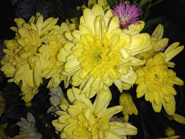 The image presents a close-up view of a dense cluster of flowers, primarily yellow chrysanthemums. Multiple yellow blooms are visible across the frame, with some petals exhibiting small, reflective specks consistent with dew or water droplets. In the upper left background, several out-of-focus white flowers are discernible against a dark backdrop. A small arrangement of purple-magenta petals is positioned on the right side, intermingled with the yellow flowers. The overall background is dark and indistinct, suggesting a low-light environment. No human subjects, animals, or specific man-made structures are present within the frame. The scene is located in the city of Yaguaracual, Venezuela.