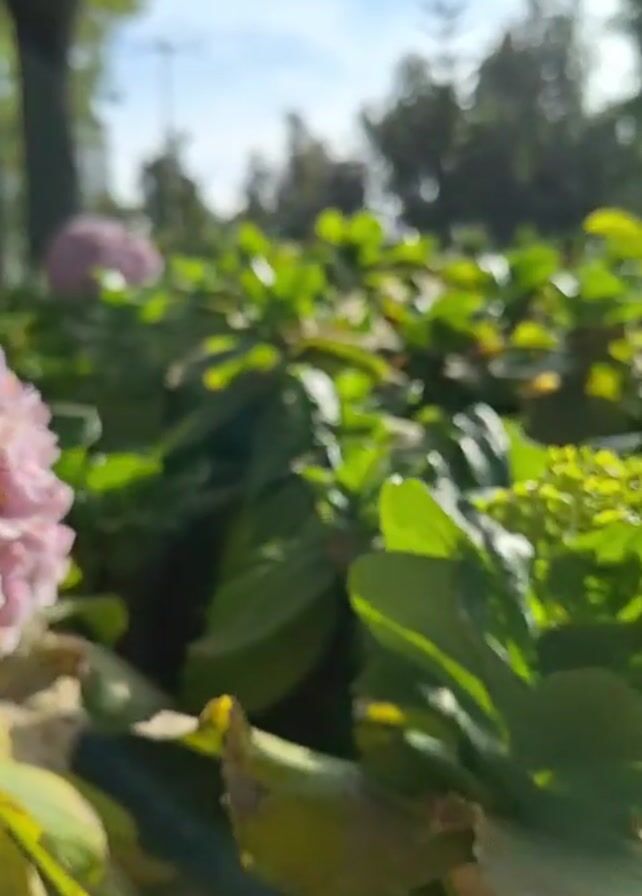 The video focuses on the leaves and flower buds of a flowering plant. At the start, a pink hydrangea bloom is featured in soft focus. The camera then shifts to various clusters of bright green buds among the plant's leaves, which occupy most of the frame. The sky is visible in the background, slightly blurred, with trees lining the horizon. The video is brightly lit with dappled sunlight, adding to the vibrancy of the plant's colors.