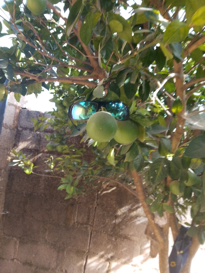 A pair of black-framed sunglasses with iridescent blue-green lenses is suspended from a branch of a citrus tree, resting against a green fruit